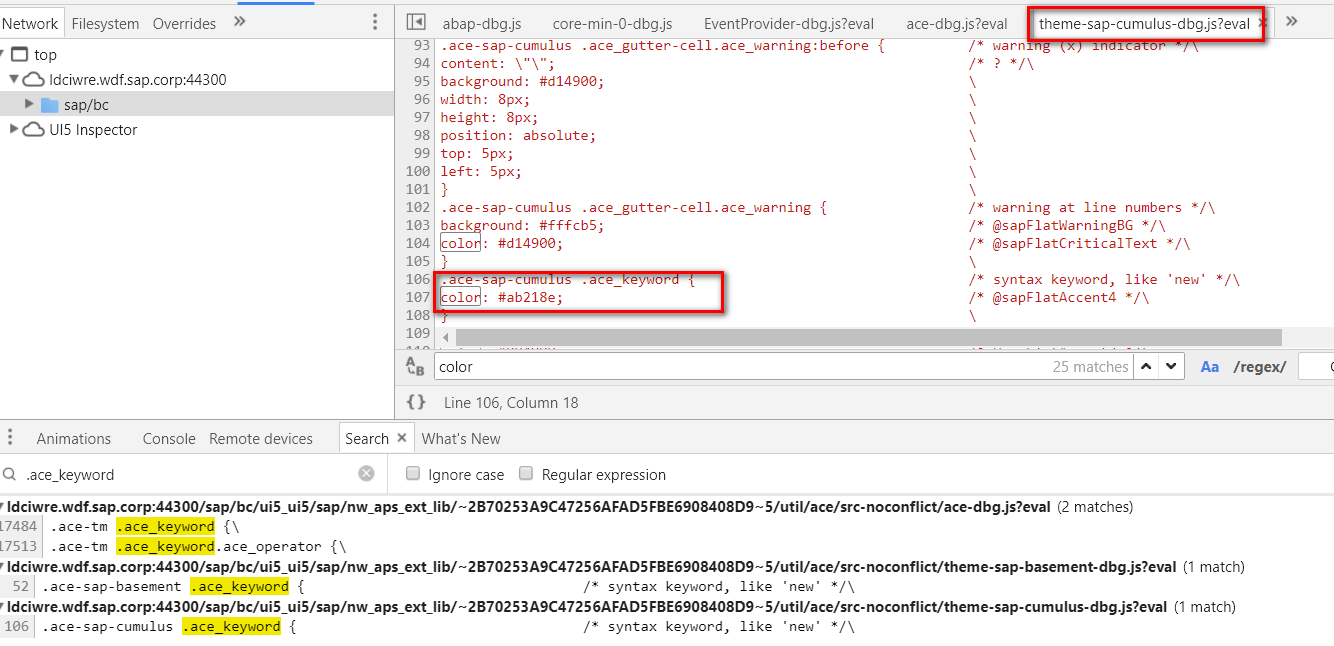 在Chrome开发工具里以关键字".ace_keyword"搜索: 发现这个css类是硬编码在theme-sap-cumulus.js里的。