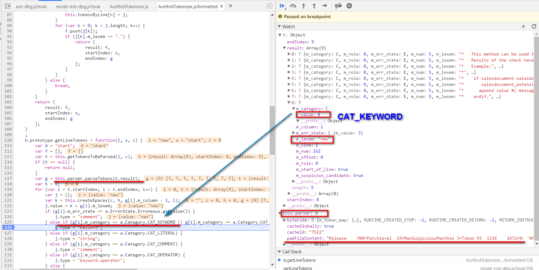 在文件AceRndTokenizer.js里, ABAP解析器按照我们期望的将“new”解析成关键字,因为解析器拥有PAD文件的引用,因此它知道哪些字符串是关键字,哪些是普通变量。