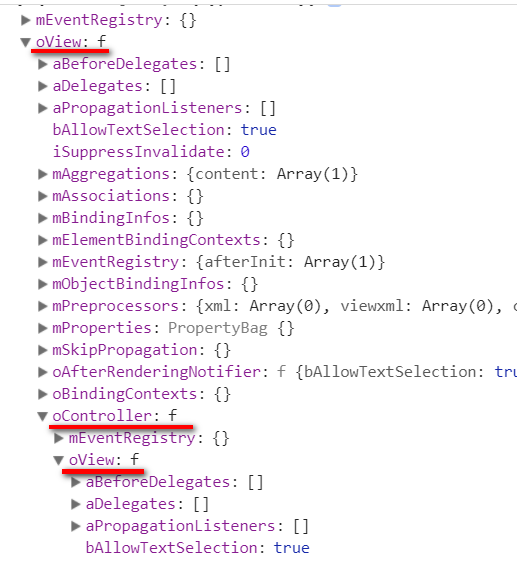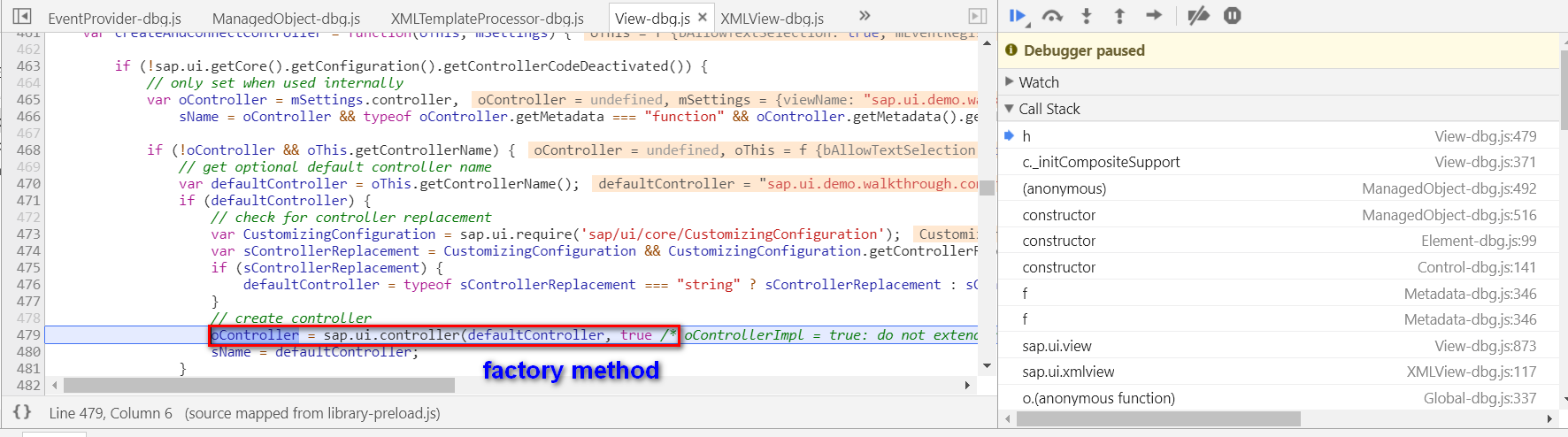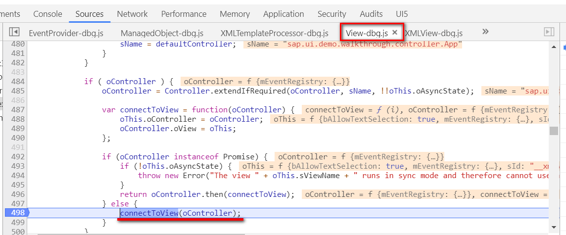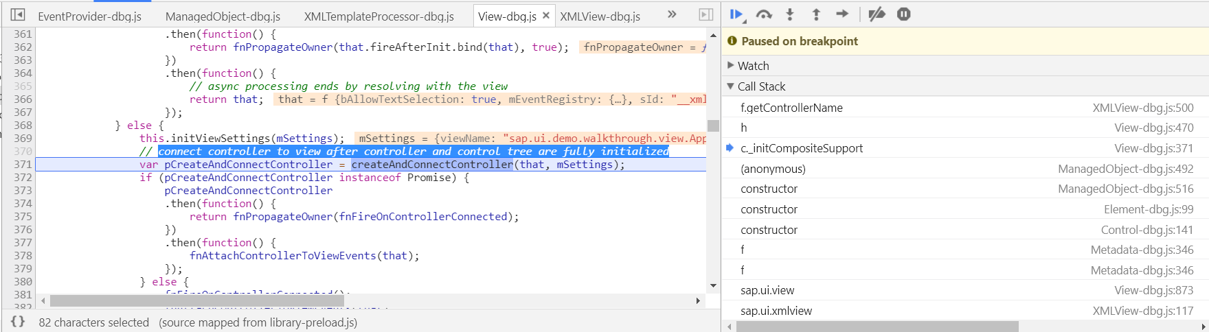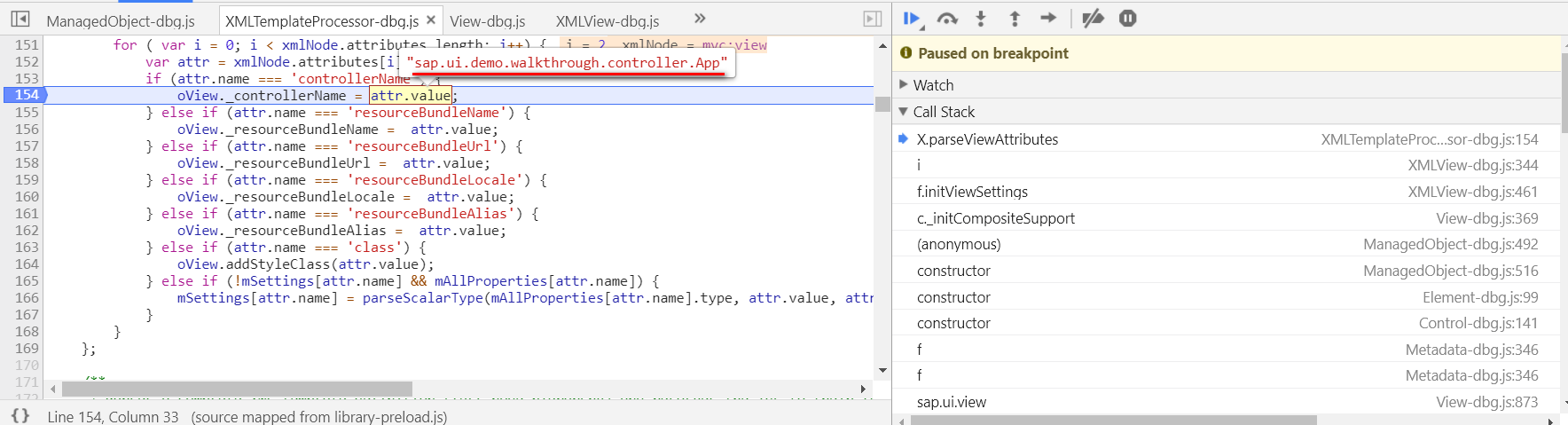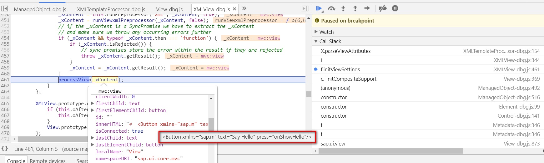在XMLView.js里,我定义的XML view的源代码被加载之后,XMLView会调用XMLTemplateProcessor, 解析XML view的内容,根据里面的control申明创建对应的UI5控件实例。下图的变量_xContent.innerHTML即为上图XML view的源代码。