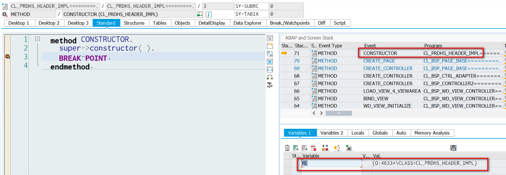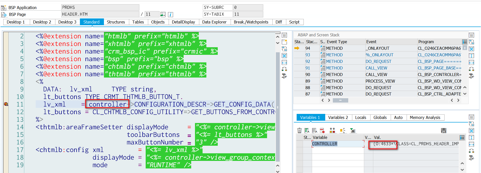 打开该view,从调用栈上下文即可得知BSP框架在什么地方初始化controller实例的。记下这个实例在ABAP runtime的地址编号4633: