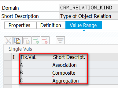 CRM的Genil model存在三种类型的relation,可以在doman CRM_RELATION_KIND里查看:
