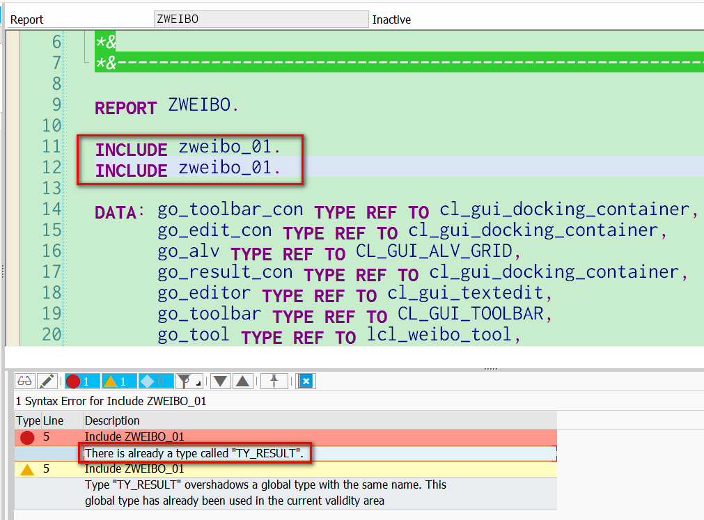 原因是因为ABAP对include这个关键字的实现和其他编程语言有点不一样,在激活时简单地把被include的program的全部源代码替换原程序里INCLUDE incl这一行,所以重复引入一个include program会报错。