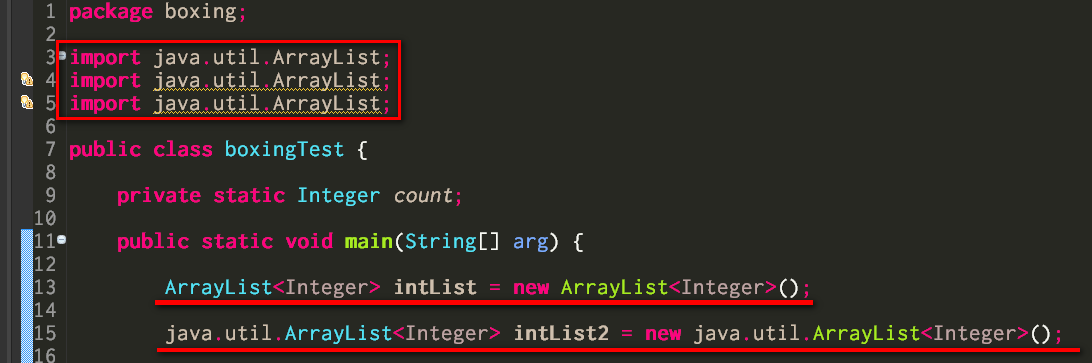Java的import和ABAP的include关键字实现的效果不一样,在Java里使用import引入包名可以让程序猿少打些字,比如比较下图第13行和第15行的写法,明显前者要简洁一些。