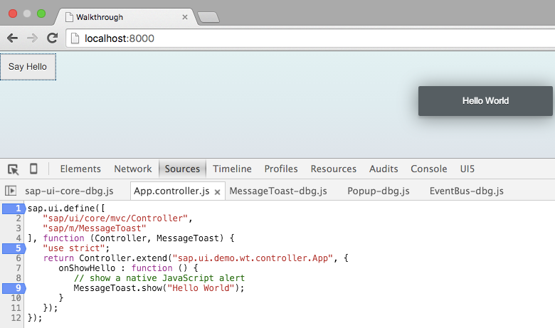 例如我需要在controller的onShowHello里通过MessageToast弹一个消息显示在UI上,