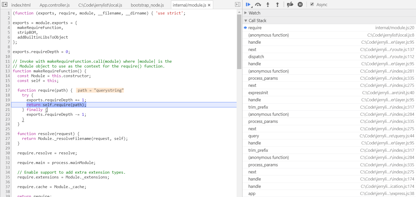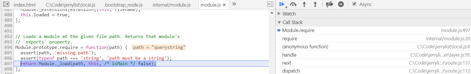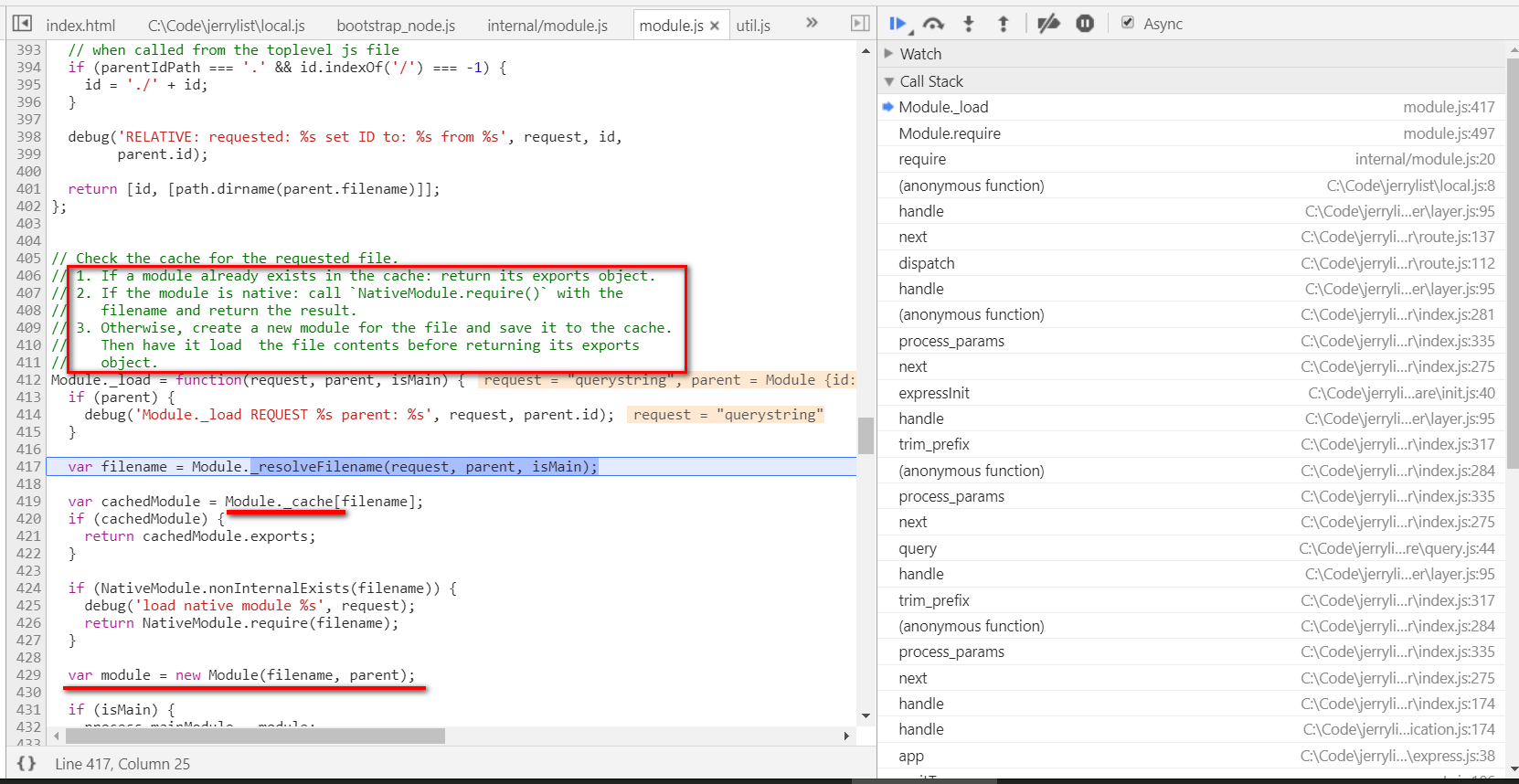 nodejs也有类似UI5的module统一管理器:Module._cache. 每次加载module时,首先从这个管理器里查看是否该module已经加载。只有当module在管理器里不存在时才会真正加载,new一个Module对象,维护好属性后存入module管理器。