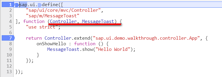 我需要先定义我自己的controller,该controller extend自UI5标准的controller module,路径为sap/ui/core/mvc/Controller, 而为了调用MessageToast的show方法,也必须先拿到MessageToast的实例。所以UI5里使用sap.ui.define去加载这两个依赖的module,加载完成后,会调用应用开发人员传入的回调函数,加载的两个module的内容作为两个输入参数传入该回调函数。