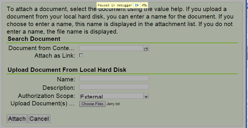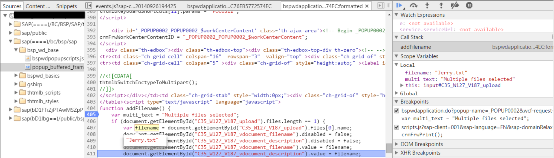 使用Chrome开发者工具调试CRM WebClient UI里附件上传的功能: 从本地选择一个文件,断点触发: