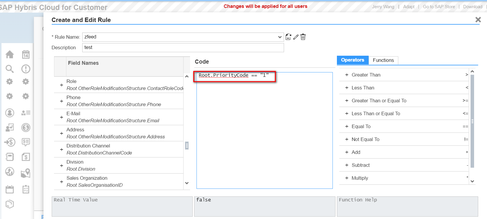 C4C UI上UI元素的显示和隐藏可以通过Key User在Adaptation模式里通过编辑一些简单的rule去控制,诸如这种格式:
