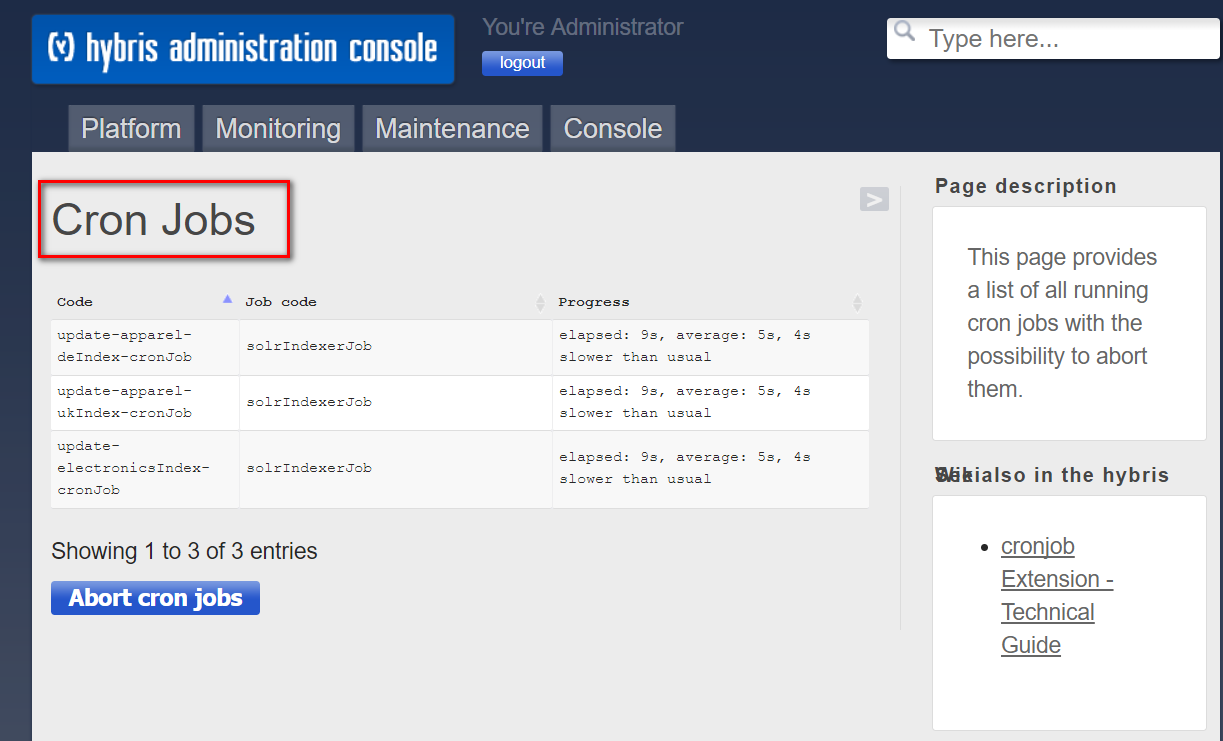 在ABAP里我们用SM37查看background job的log, 在Hybris里则是在Administration console里查看cron job的执行: