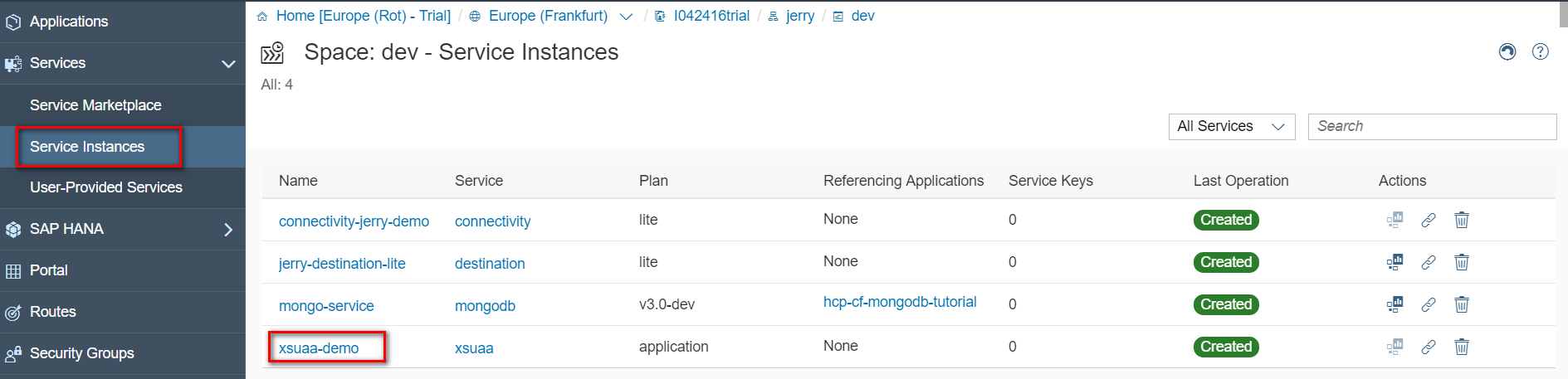 需要在SAP云平台CloudFoundry环境的space里配置同名的实例: