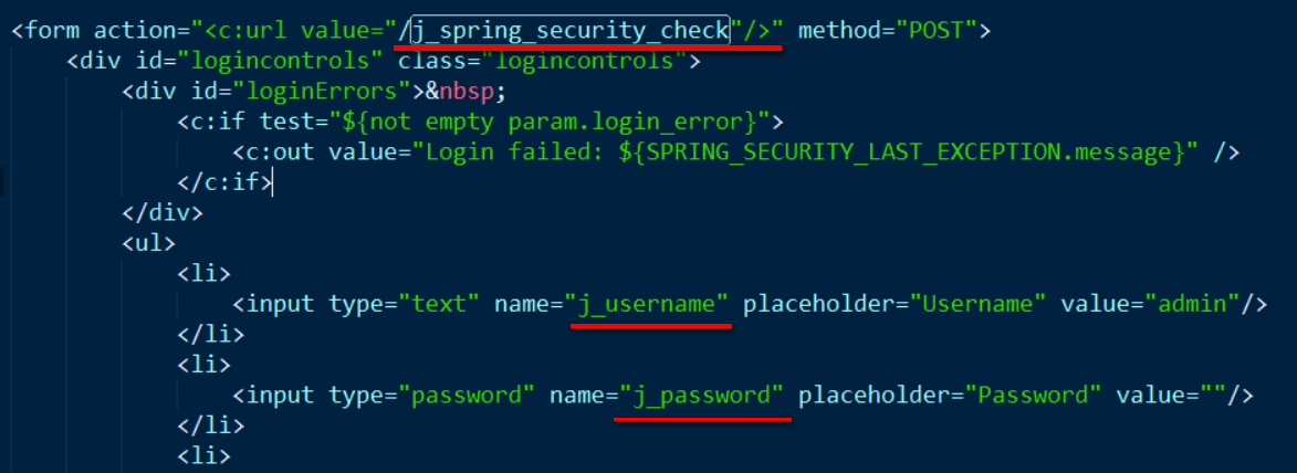 这个请求定义在一个form action里,还有两个字段用于存储用户输入的用户名和密码: