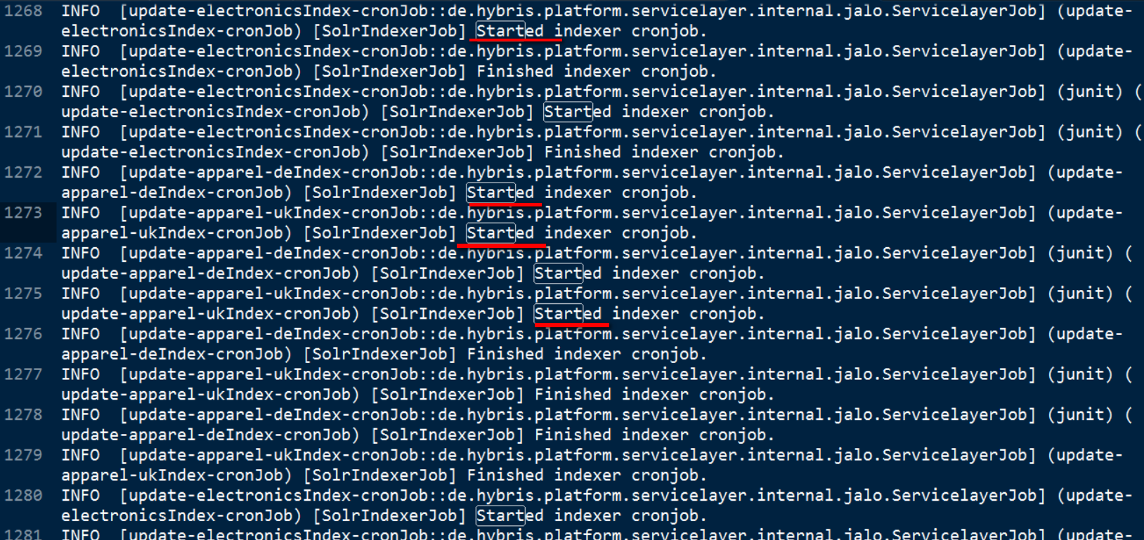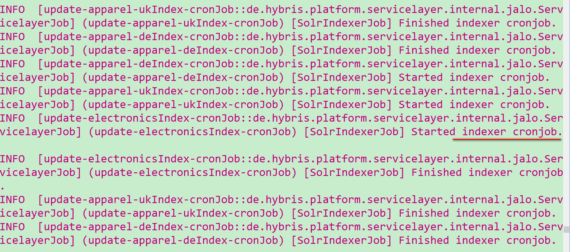 默认设置下cron job在Hybris服务器启动时会自动启动,这一点可以在Hybris服务器启动日志里查看: