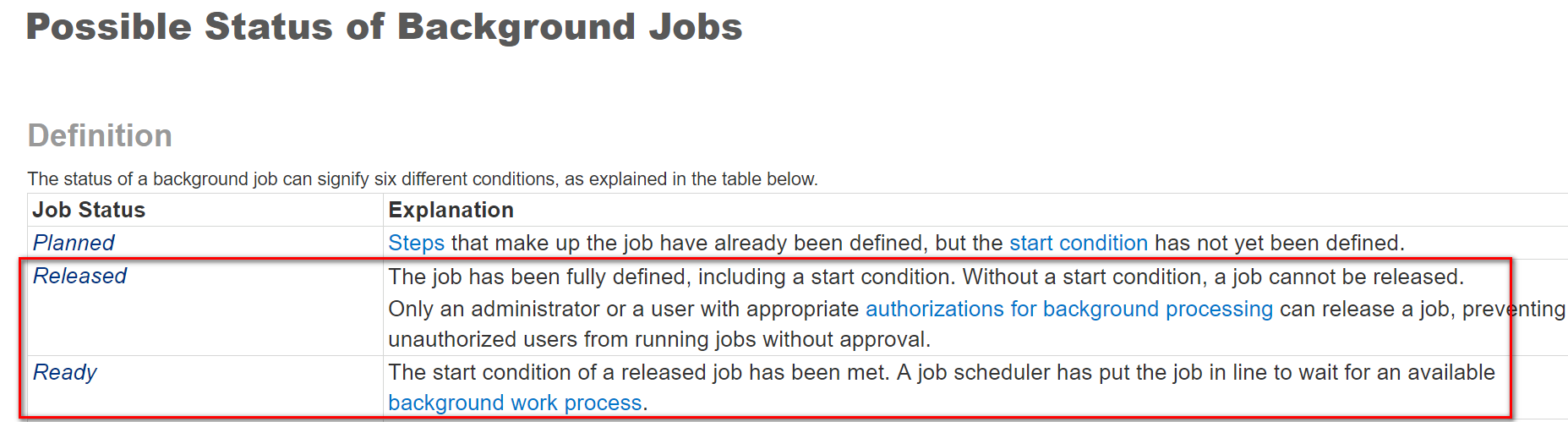 注意后台作业的状态Released和Ready的区别:Released只是表明一个作业的各种属性包括开始条件均已定义妥当。而Ready表明该作业的开始条件已经满足,等待有可用的后台工作进程选择该作业,之后状态就能变为Running。