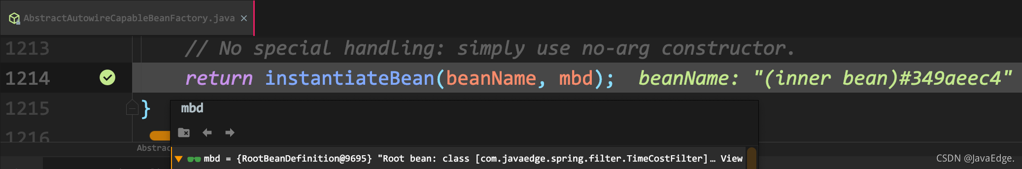 - FilterRegistrationBean 在被创建时(createBean)会创建 TimeCostFilter 装配自身,而 TimeCostFilter 是通过 ResolveInnerBean 创建的