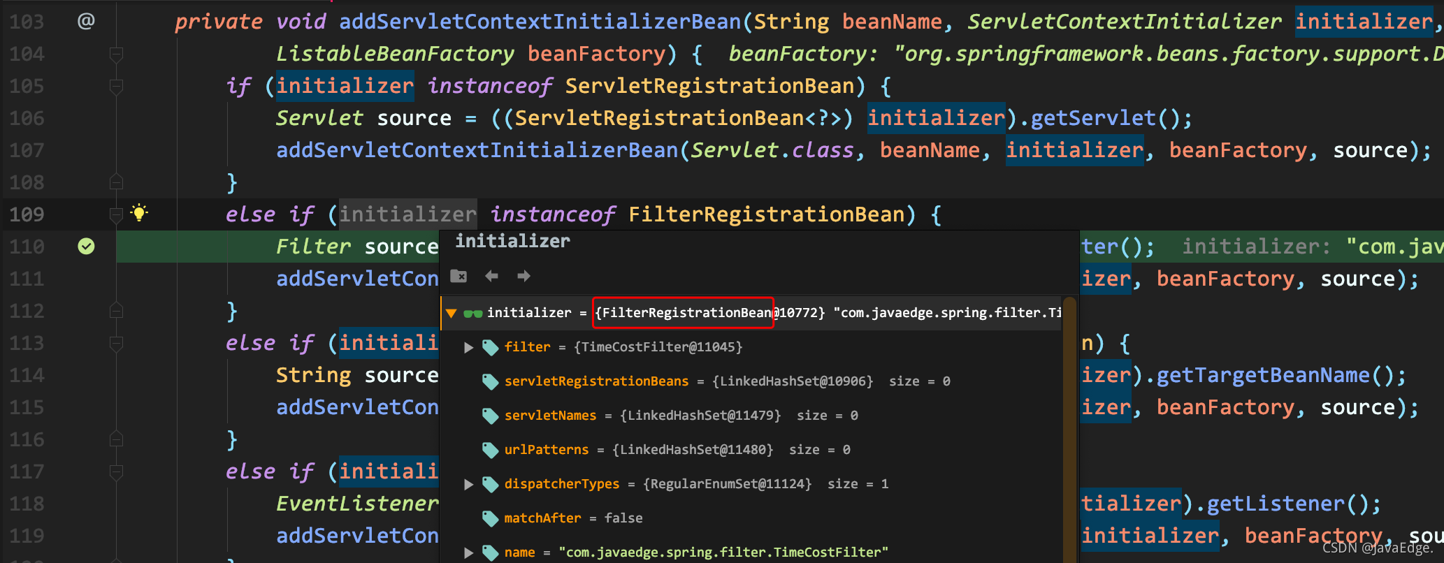 前文解析可知,使用 @WebFilter 修饰过滤器时,TimeCostFilter 类型的 Bean 并没有注册至 Spring 容器,真正注册的是 FilterRegistrationBean。