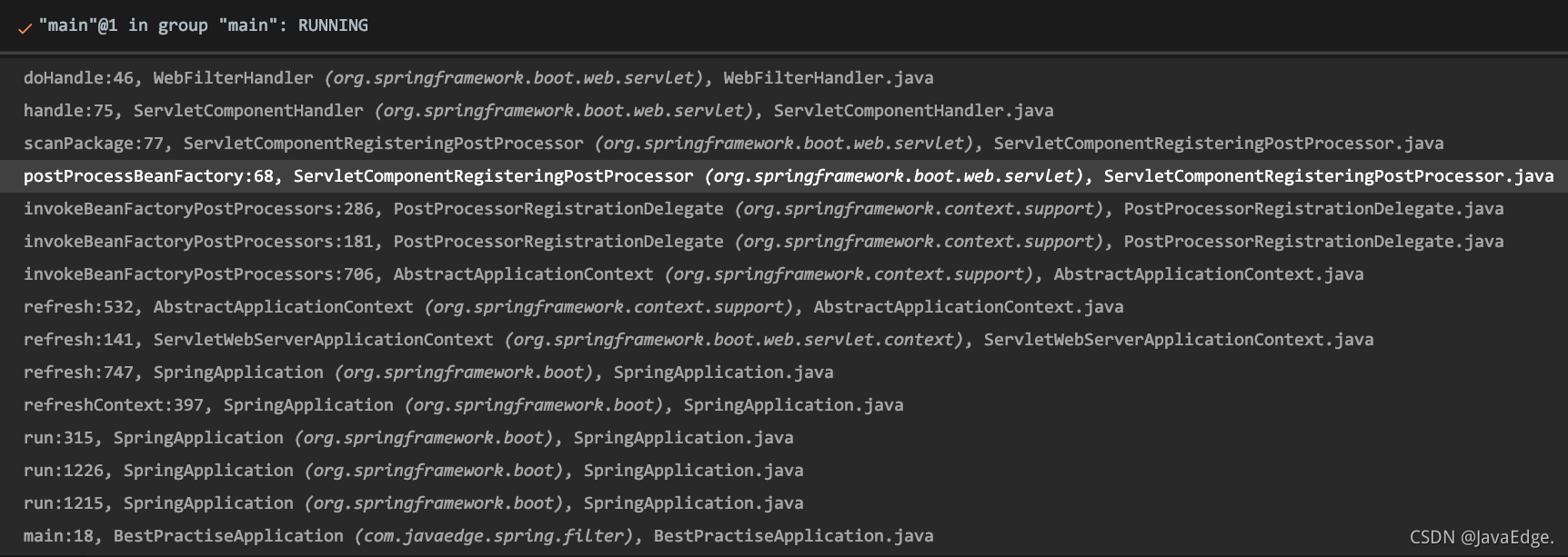可见对 @WebFilter 的处理是在SB启动时,在ServletComponentRegisteringPostProcessor被触发,实现对如下注解的的扫描和处理: