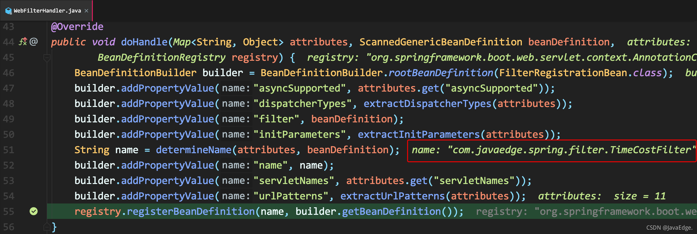实现上来说,即 FilterRegistrationBean#Filter 属性就是 @WebFilter 标记的实例。这点我们可以从之前给出的截图中看出端倪。