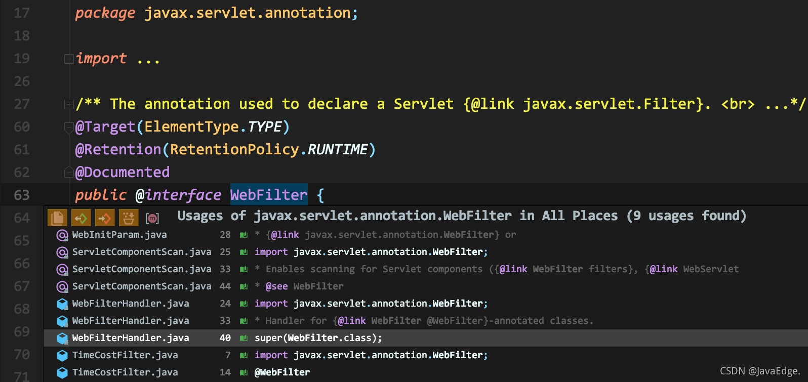 直接搜索对 @WebFilter 的使用,可发现 WebFilterHandler 使用了它: