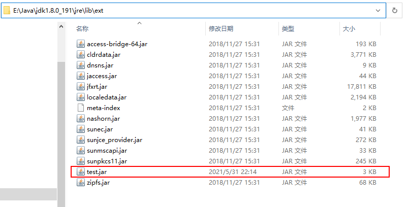 3、将Person.class打包成test.jar复制到<JAVA_RUNTIME_HOME>\lib\ext目录下