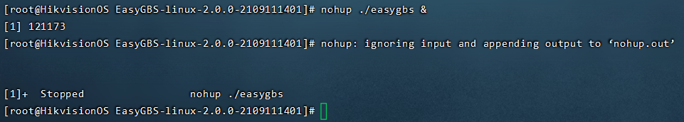 针对该问题,我们可以在进入Linux系统后,先用ps -ef|grep easygbs命令(如下截图命令操作)查询有无残留进程,如果有残留EasyGBS进程就用命令(kill -9)强行杀掉,之后在用命令(nohup ./easygbs &)启动服务,再访问Web网页,即可正常播放视频。