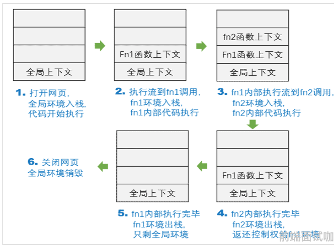 1 .或称调用栈(Call stack), 一段js程序中一般会创建多个执行上下文,JS运行前会创建一个执行栈来储存并管理所有的上下文。每调用一个函数都会创建相应的执行上下文并推入栈中。栈底是全局执行上下文,栈顶是当前函数执行上下文,遵循栈结构先进后出的原则。