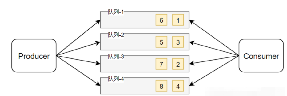 而消费消息的时候从多个queue上拉取消息,这种情况发送和消费是不能保证顺序。