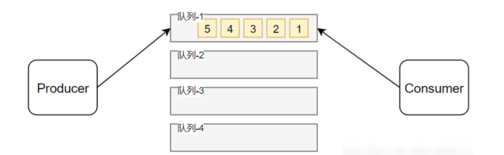但是如果控制发送的顺序消息只依次发送到同一个queue中,消费的时候只从这个queue上依次拉取,则就保证了顺序。如下图所示: