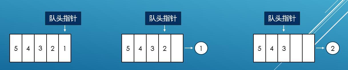 总共有1,2,3,4,5个数据,那么队头指针指向队列缓存首地址,接着第一个出列的就是数据1。