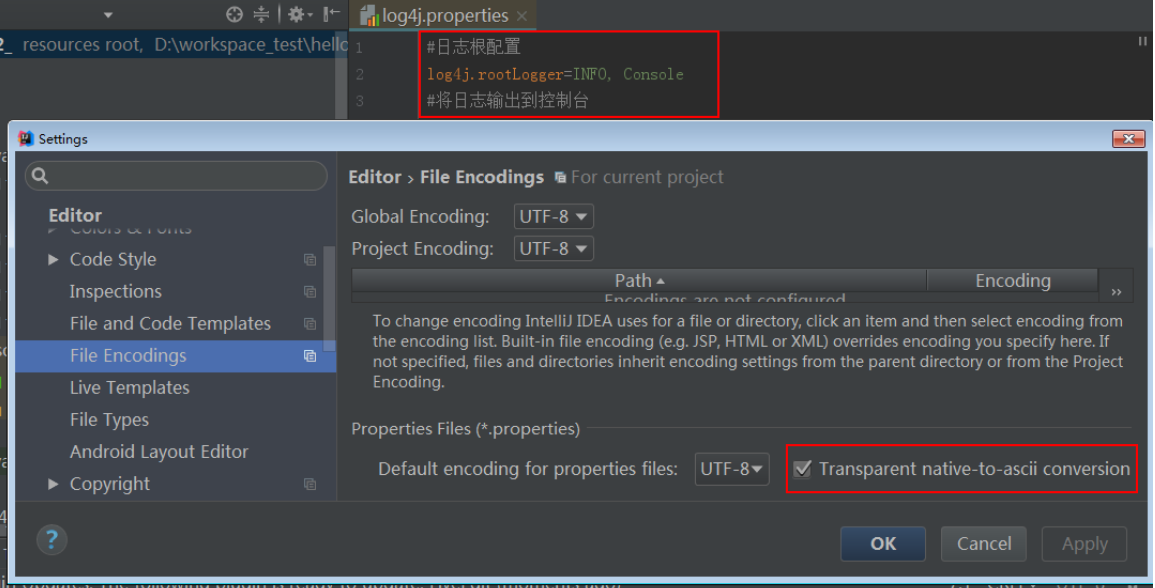 设置后:settings-->editor-->file encodings-->勾选transparent native...