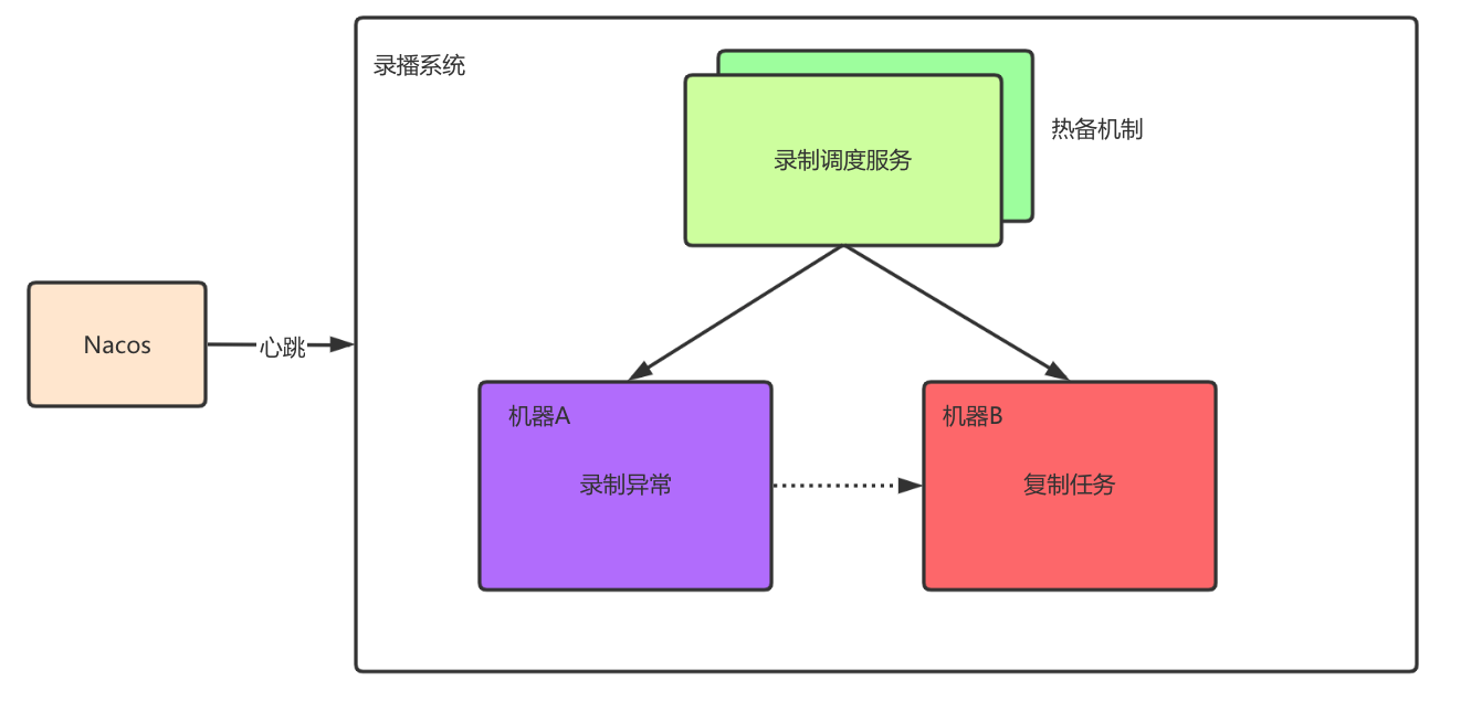 录制过程中会遇到各种各样的问题,接下会分别介绍。有一点是相同的,所有的异常状况都会通知到录制调度服务,由调度服务进行统一分析和管理,同时支持热备机制,我们通过 Nacos 的服务发现机制监测录制调度服务的运行状态,具体关系可以参考下图: