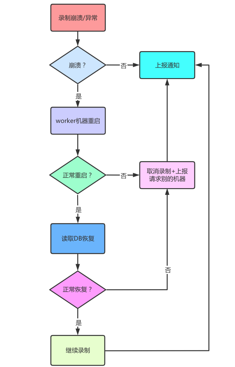 异常发生时,如果是一般异常,我们只需要将状态通知调度服务即可,调度服务记录相关日志,综合分析整个录制服务的状态。如果 60%的录制机器触发了相同的异常,调度服务就要采取相应的策略。如果是崩溃等重大异常,就需要重启机器或者调度新的机器继续执行录制任务。