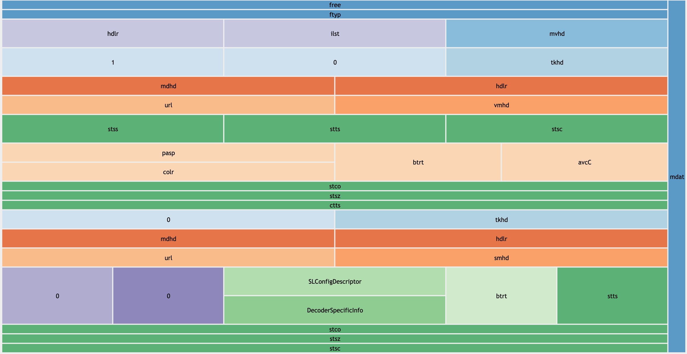 我们知道 mp4 文件是由许多 Box 和 FullBox 组成的,可以参考上图的 Box 树形图,其中,FullBox 是 Box 的扩展,每个 Box 又包含 Header 和 Data 两部分,moov Box 记录了整个 mp4 文件的音视频媒体信息。而 moov Box 一般是在 mp4 文件写完时才在文件尾部添加。因此,又引出了另外一个缺点,如果 mp4 文件特别大,那么在播放的时候,播放器需要加载全部的视频文件到内存中,如果视频文件特别大,这几乎是不现实的。因此,我们在录制结束保存 mp4 的时候,需要把 moov Box 调整到文件头部来避免这个问题。