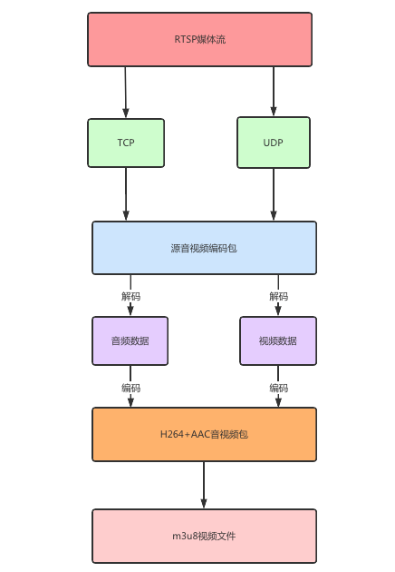 利用纯原生的 Golang 实现,其实,Golang 处理音视频数据还是有一定优势的,通过解封装 RTSP 媒体流,得到音频数据和视频数据,然后创建对应的解码器,得到对应的原始音频 PCM 数据和原始视频 YUV 数据,再分别编码成 AAC 的音频和 H264 的视频,最后保存成 m3u8 格式的录制文件。整个过程可以参考下图: