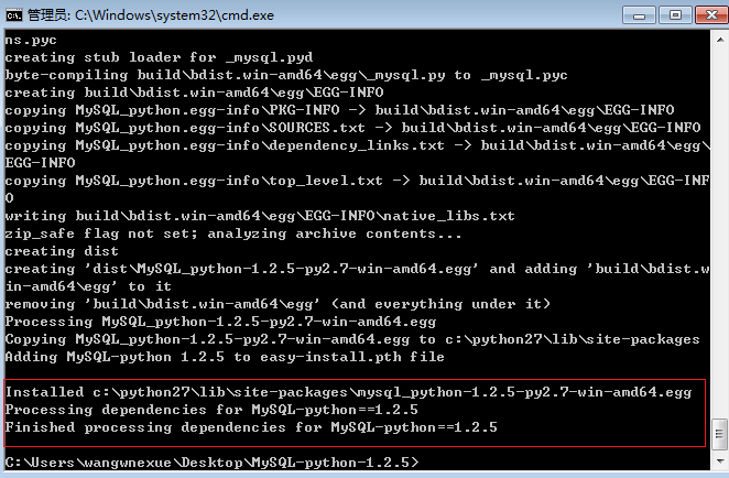 4. 运行cmd,输入命令cd到MySQL-python-1.2.5文件夹目录,运行 python setup.py install 即可安装完成。