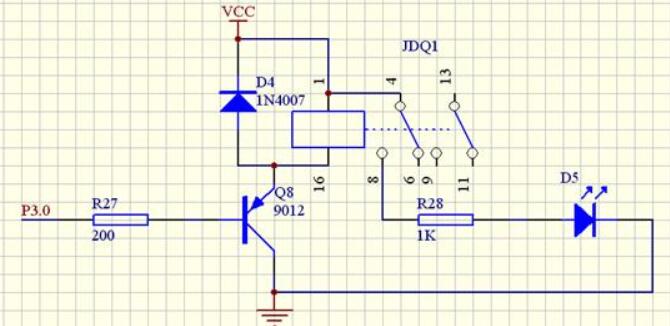 上面这个电路的P3.0就是接的单片机芯片的引脚,我们通过写程序控制这个引脚输出信号就能达到控制继电器的目的。
