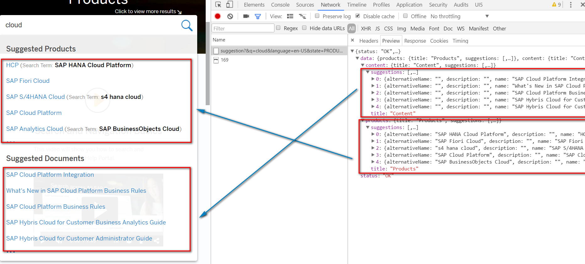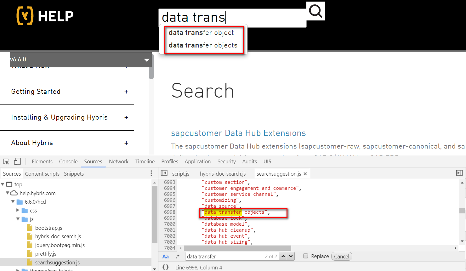 我使用help.hybris.com时,发现每次在搜索栏输入文字时,没有发出任何HTTP请求,那么这个自动完成的下拉框里的记录从哪里来的?我看了下实现,发现所有自动完成下拉框里的记录都是硬编码在searchsuggestion.js里: