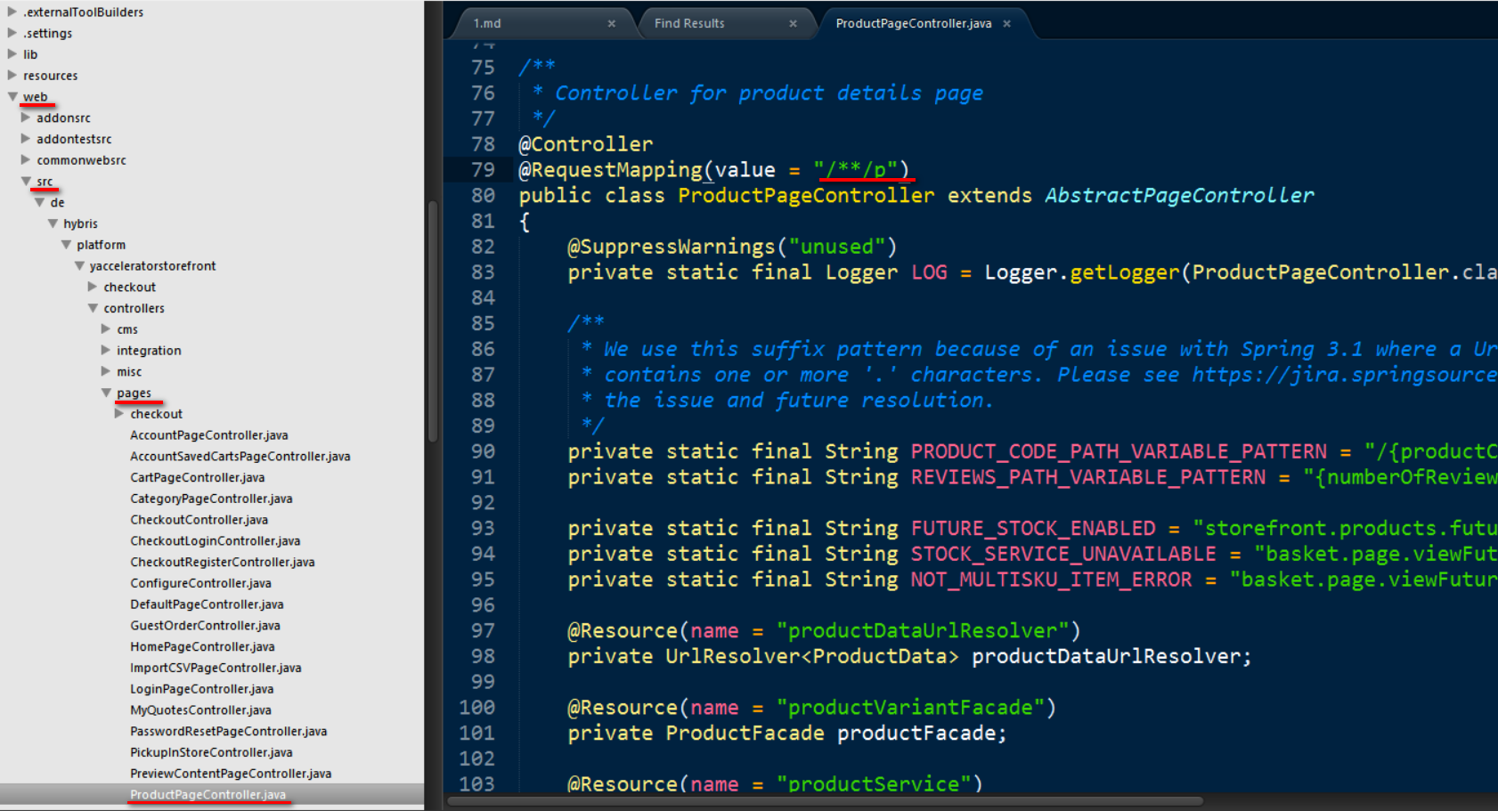 回到Hybris,这个url https://localhost:9002/yacceleratorstorefront/electronics/en/Open-Catalogue/Cameras/Digital-Cameras/Digital-Compacts/DSC-H20/p/1978440_blue的请求的处理交由文件夹pages的controller ProductPageController处理: