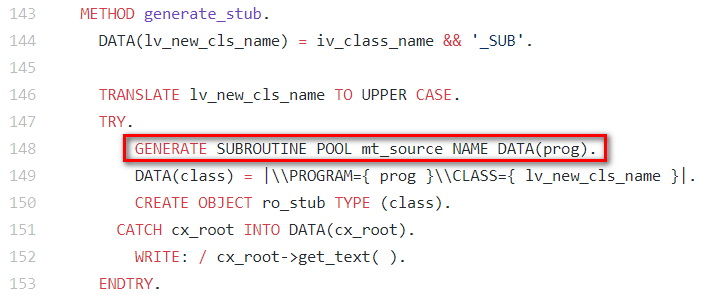 或者用另一种土办法,直接把待生成的类或者报表的源代码准备好,填入一个内表(下图例子中的mt_source)里,然后用关键字GENERATE生成: