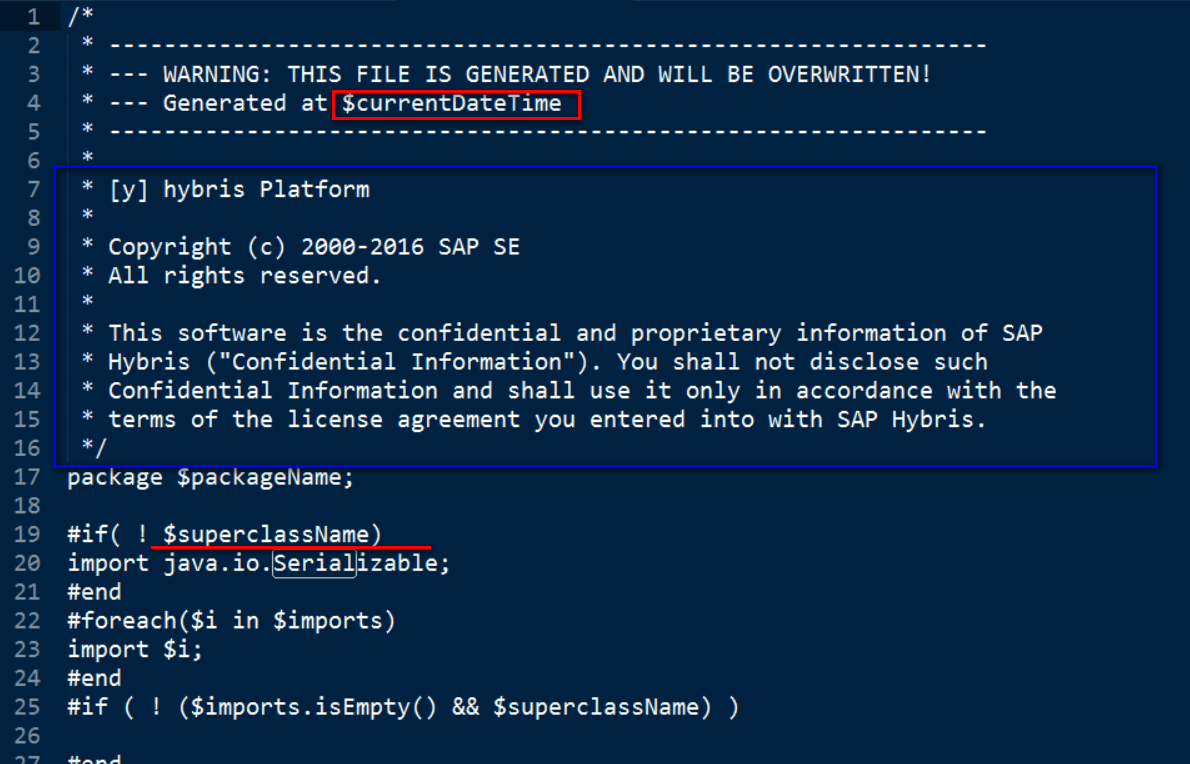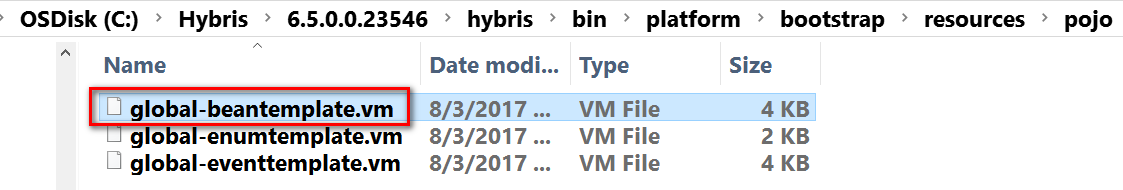 最终我们在Hybris安装包里观察到的源代码是基于一个模板文件生成的,具体位置:global-beantemplate.vm