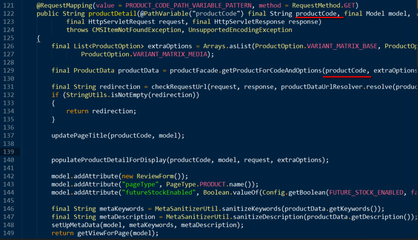 根据SpringMVC提供的注解@requestmapping, 在运行时当前产品的编号会被自动赋值给变量productCode, 然后通过类似CRM WebUI BOL layer->Genil layer->DB layer的路径把对应product的数据取出来,最后填充给model变量。这个model变量最后用于在JSP UI上显示数据。
