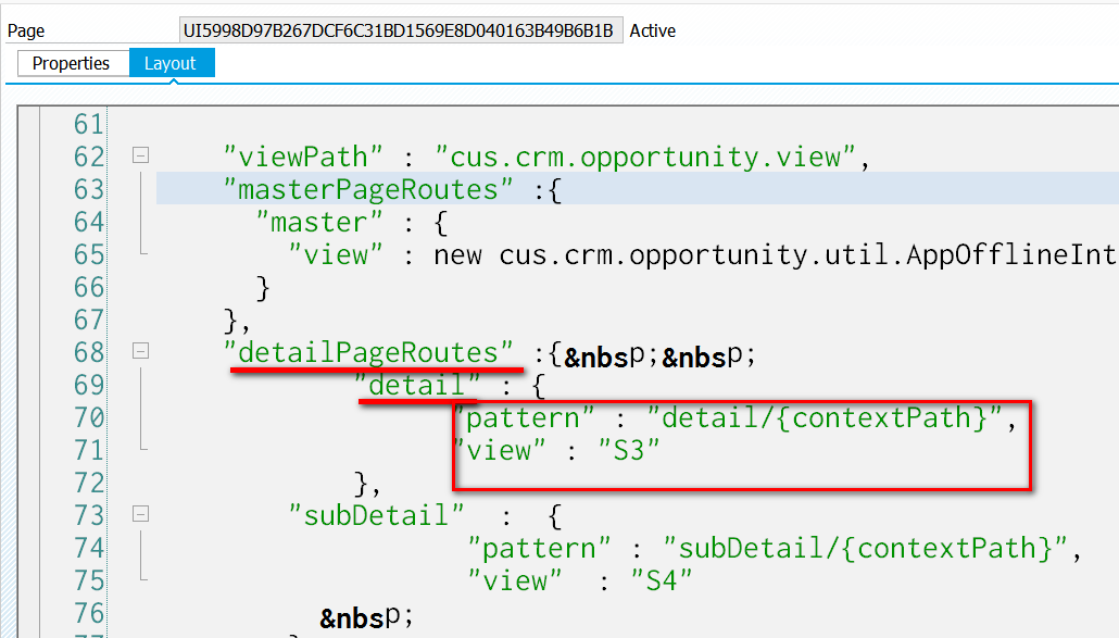 在SAP UI5应用里,每个页面都会有一个对应的路由配置信息。该信息的结构如下图所示,包含一个页面的逻辑名称,路由的target url和页面的实际名称。我们在浏览器地址栏里看到的detail为逻辑名称。