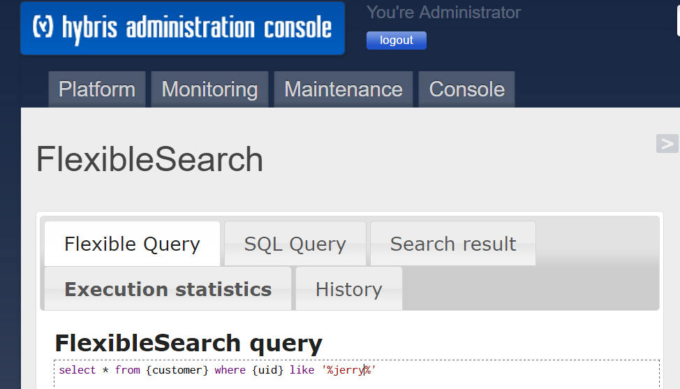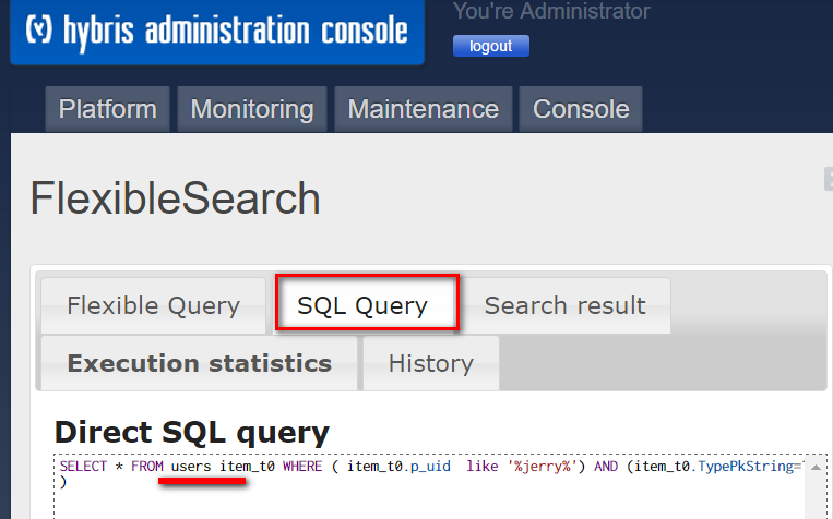 在Hybris Administration console里使用flexible search试图去查询该customer: