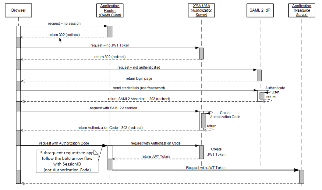 如果熟悉OAuth2.0协议,从这张流程图上很快就能看出App Router和UAA之间是通过Authorization Code Grant Flow来交互的,在交互过程中它们分别充当了OAuth Client和OAuth Server的角色。
