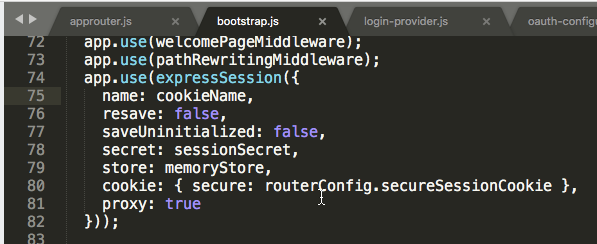 App Router上的session管理利用了Node.js的session-express框架,默认将session缓存在instance memory中(下图第79行):