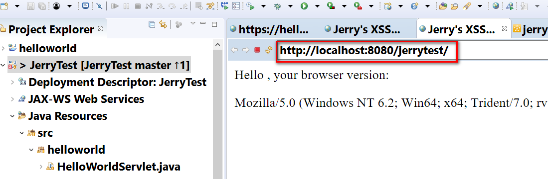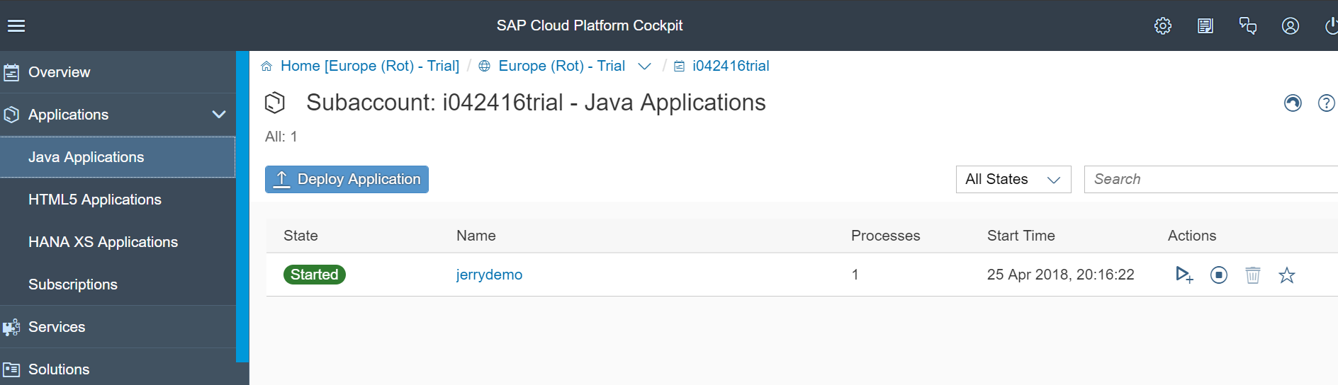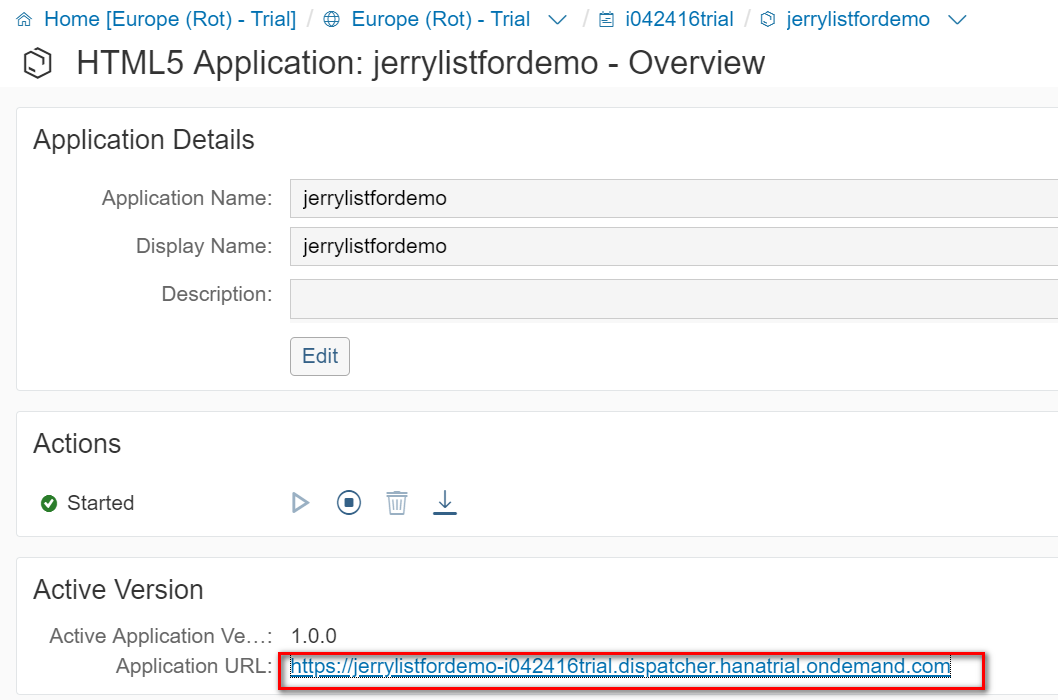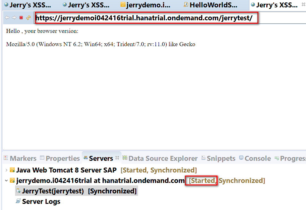 成功之后,即可在Eclipse里看到SAP云平台的实例,jerrydemo这个应用在上面的状态处于Started状态。Eclipse内置的浏览器自动打开该应用。