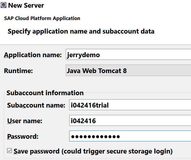 应用程序的名称填jerrydemo,Runtime选择Java Web Tomcat 8,输入SCP平台的用户名和密码: