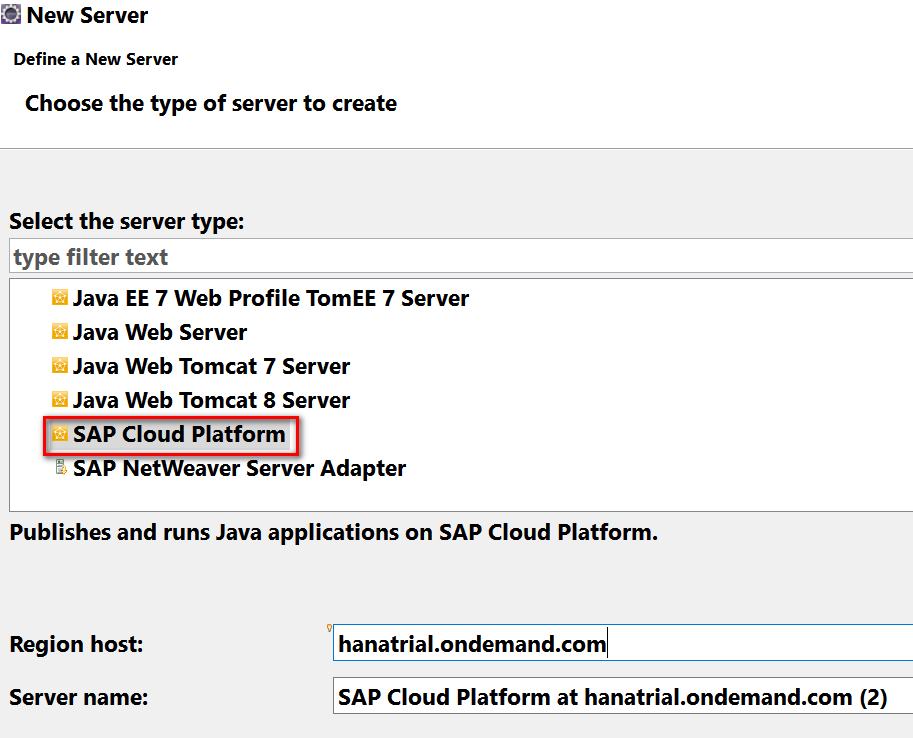 然后新建一个服务器实例,类型为SAP Cloud Platform,主机名填hanatrial.ondemand.com: