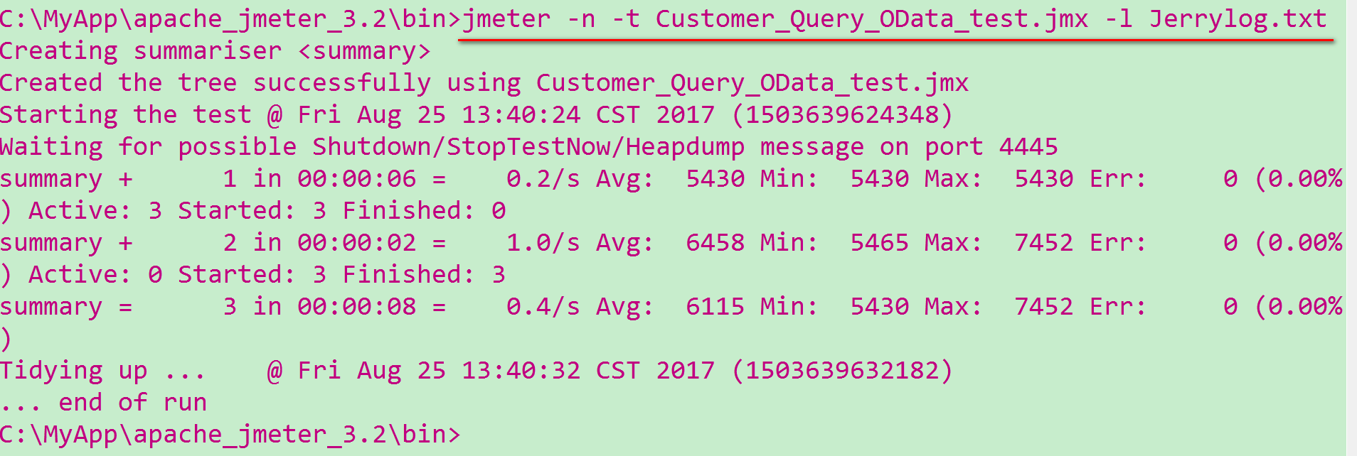 也可以用命令行 jmeter -n -t 的方式执行测试,看到的结果和在jMeter GUI上执行的一致。