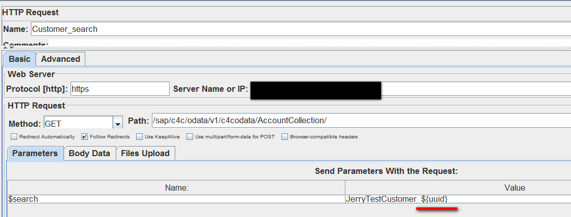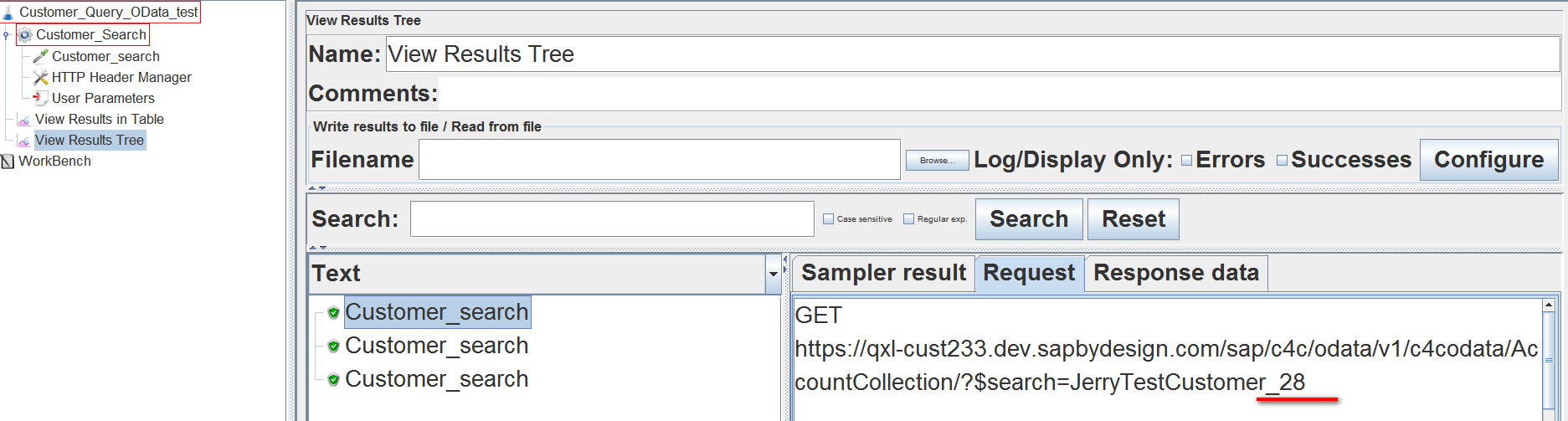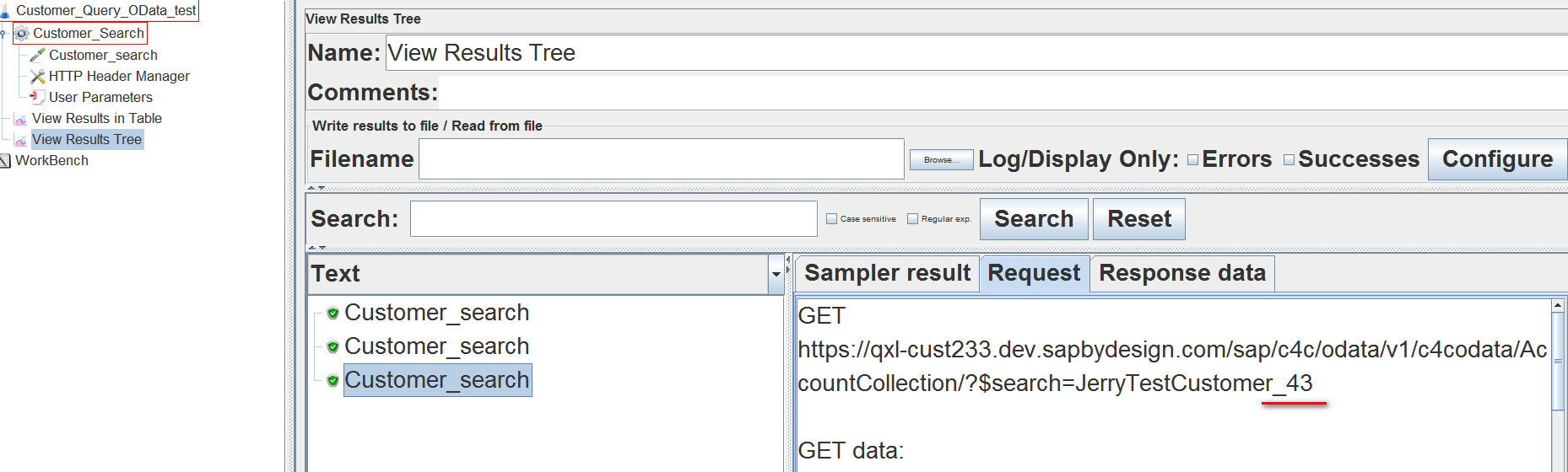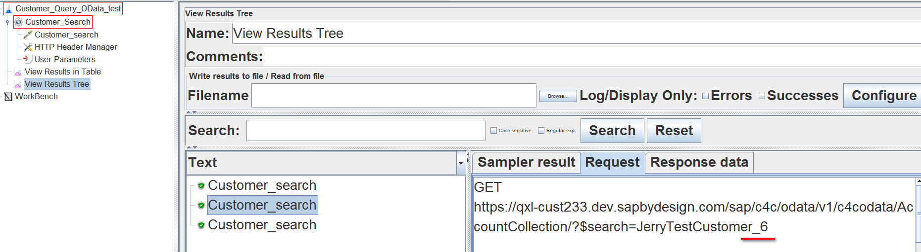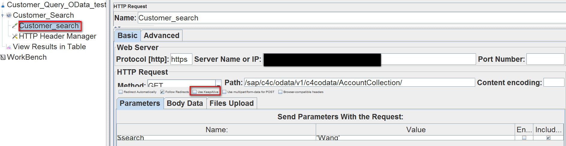 在参数标签页,维护参数名称$search, 值为’Wang’。这个请求的意思是使用Odata请求查询账号名称为’Wang’的实例。