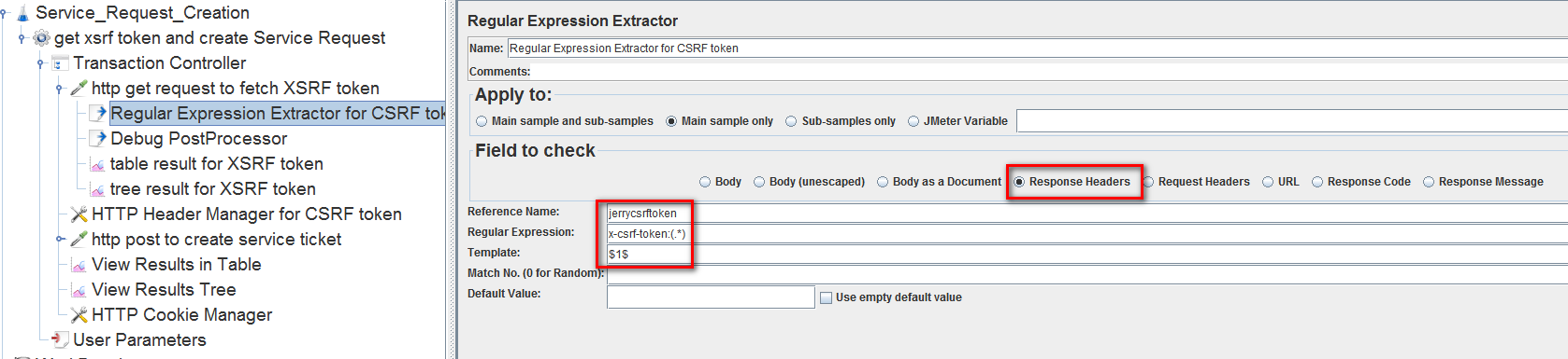 创建一个参数jerrycsrftoken,使用正则表达式将服务器通过HTTP响应头部返回的token解析出来并保存。